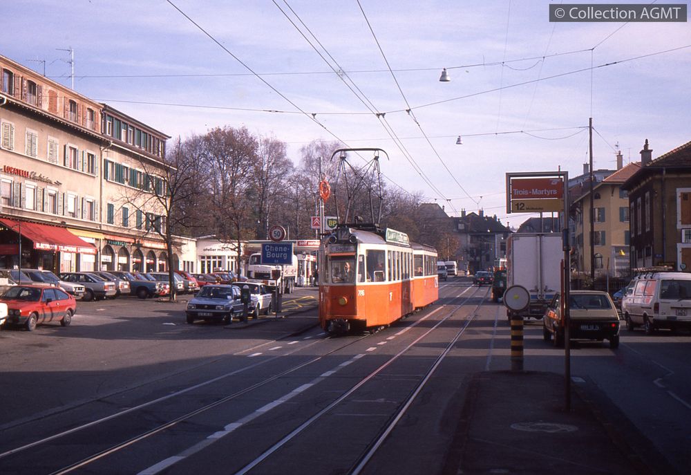 3141(494.42)_TPG_1988-11_d.jpgImage JpegEn service sur la ligne 12 à destination du Bachet, un convoi TPG mené par l'automotrice 706 quitte Chêne-Bourg / Jeremy Wiseman