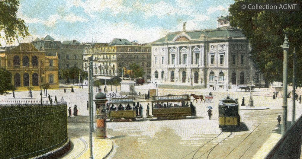 X1 acheté 8 fr. au marché aux puces à Genève le 17 mars 2007 - X2 acheté 8 fr. au marché aux puces à Genève le 21 juin 2014.Genève : place Neuve et théâtre [document graphique à deux dimensions] . - Francfort s/M. : G. Bluemlein, [ca 1901] . - 1 photo : couleur ; 9 x 14 cm.