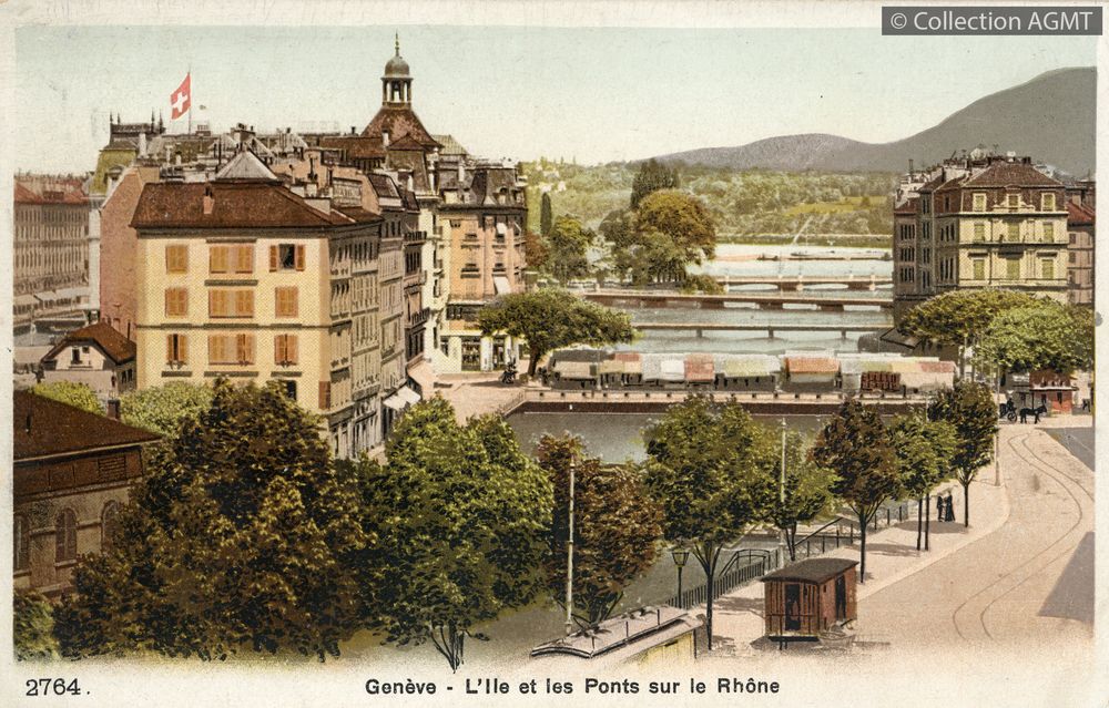 [Année] 1905Index. décimale : 4145 Tramway et métro léger interurbain et vicinal - véhicule - service marchandises, postal, des manoeuvres Genève : l'Ile et les ponts sur le Rhône [document graphique à deux dimensions] . - [S.l.] : [s.n.], [ca 1905] . - 1 carte postale : colorisée ; 9 x 14 cm.