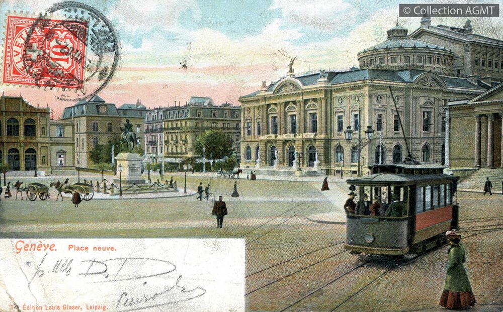 [Année] 1903Index. décimale : 3141 Tramway et métro léger urbain - véhicule - service régulier, transport de voyageur Résumé : Achetée 5 fr. à une bourse à Meyrin le 29 novembre 2008. La carte a circulé le 15 décembre 1907. Genève : place Neuve [document graphique à deux dimensions] . - Leipzig : Louis Glaser, [ca 1903] . - 1 photo : couleur ; 9 x 14 cm.