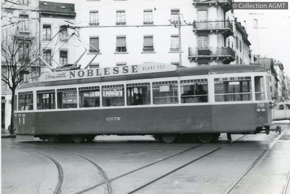 PermalinkPermalinkEn service sur la ligne 1, sens B, l'automotrice 736 de la CGTE croise les voies de la ligne 12 au carrefour de Rive / Heinz Bircher