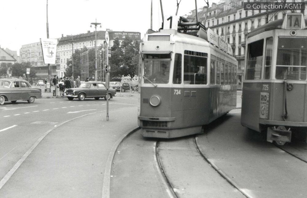 PermalinkSur la place Cornavin, croisement des automotrices 725 et 734 en service sur la ligne 1 / Jacques Bazin