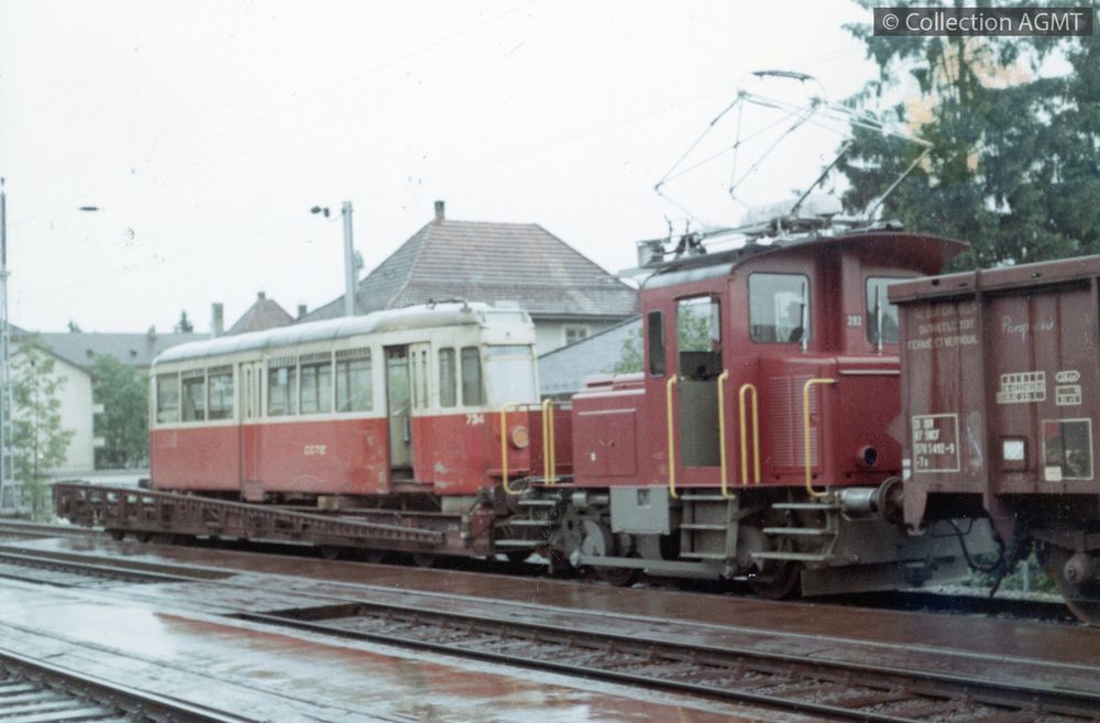 3146(494.32)_cGTe_1969-02.jpgImage JpegEn gare de Solothurn-West, l'automotrice 734 de la CGTE, chargée sur un wagon CFF, attend son transfert à l'usine Hess où elle sera transformée en remorque / Robert Madel