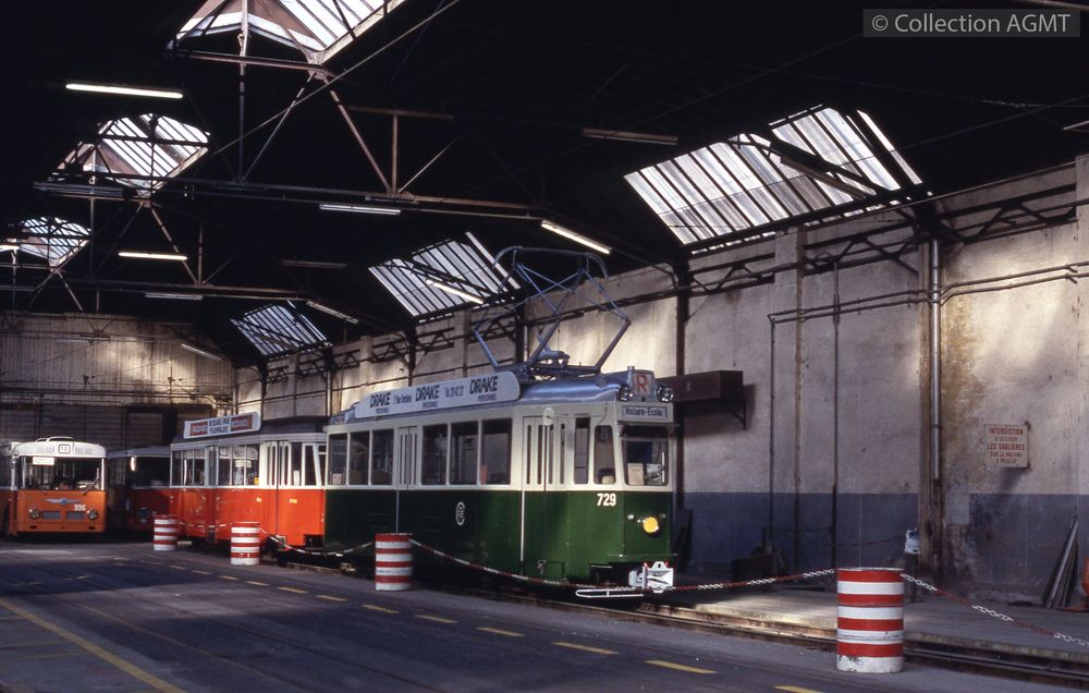 Code-barres Cote Support Localisation Section Disponibilité 6700017830 3148(494.42) AGMT 1988/10 Photographie Bachet Photographies Disponible L'automotrice 729 ex-TPG, préservée par l'AGMT, stationne sous une halle du dépôt de la Jonction, en compagnie de la remorque 328 / Richard J.S. Wiseman
