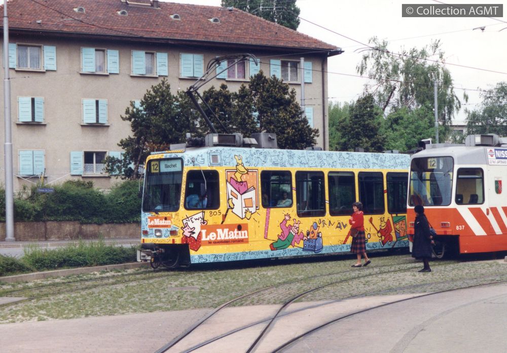 Permalink"En tête d'une double traction de la ligne 12, l'automotrice 805 en livrée publicitaire ""Le Matin"", démarre de l'arrêt ""Tronchet"" en direction du Bachet" / Eric Rahm