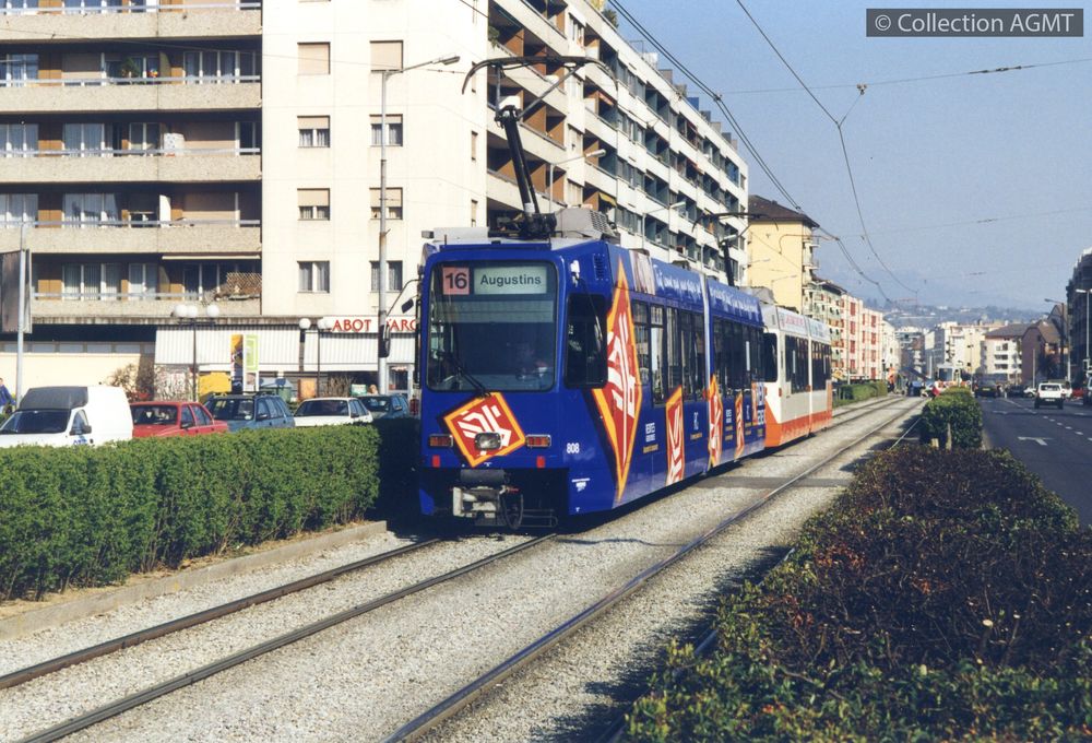 3142(494.42)_TPG_1997-01_d.jpgImage Jpeg"Circulant sur la ligne 12 en direction de Moillesulaz, l'automotrice 808 en livrée publicitaire ""Rentes genevoises"" marque l'arrêt ""Grange-Falquet""" / Eric Rahm