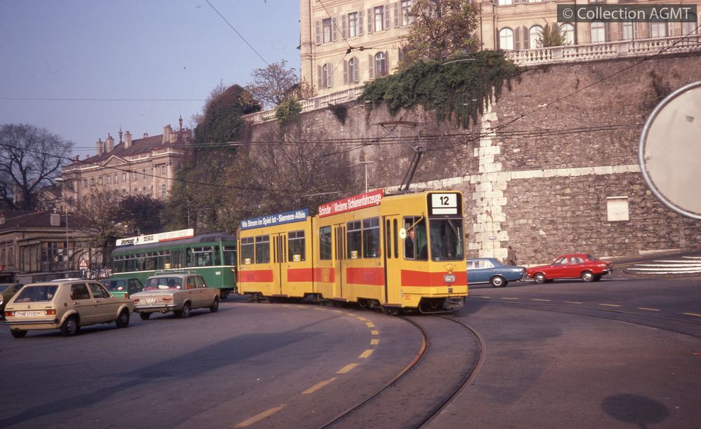 PermalinkLe convoi formé de l'automotrice BLT 202 et de la remorque 1447 des BVB, en essais sur la ligne 12 des TPG, traverse la place de Neuve en direction de Carouge / François Chapuis