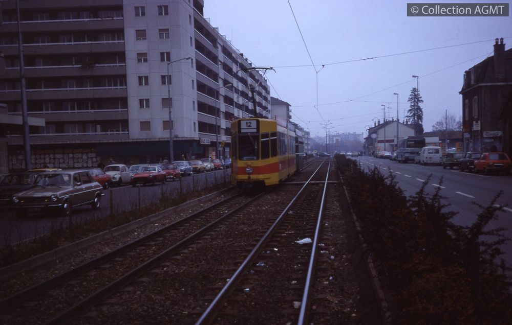 3141(494.42)_TPG_1978-03.jpgImage JpegLa Be 4/6 202 du BLT accompagnée de la remorque C4 1447 des BVB circule sur le site propre de la rue de Genève à Thônex en direction de Moillesulaz / Eric Rahm
