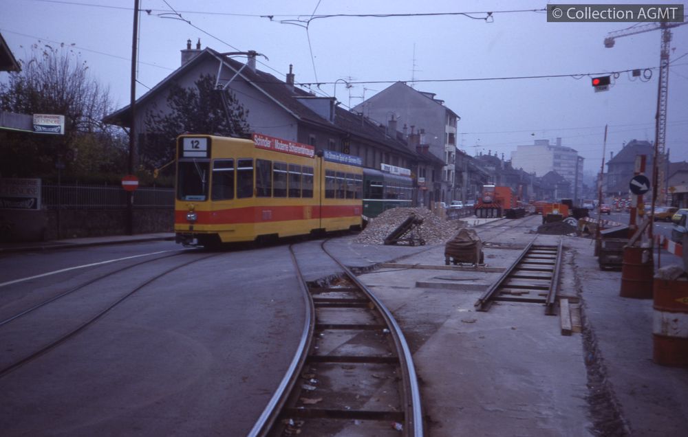 PermalinkLe convoi formé de l'automotrice 202 du BLT et de la remorque 1447 des BVB, en essais sur la igne 12 des TPG, circule à la rue de Genève à Chêne-Bourg, où les voies sont en cours de reconstruction en site propre au centre de la chaussée / François Chapuis