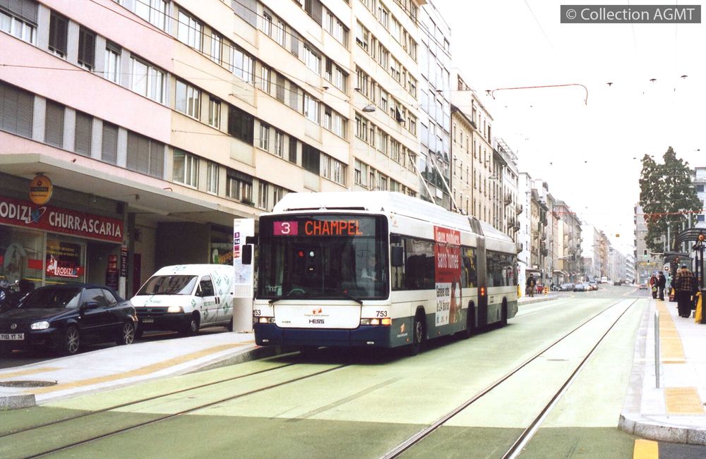 [Année] 2008Index. décimale : 3541 Trolleybus, gyrobus, véhicule bi-mode urbain - véhicule - service régulier, transport de voyageur Genève, rue de la Servette : "le trolleybus 753 des TPG, en service sur la ligne 3 à destination de Champel, marque l'arrêt ""Lyon""" [document graphique à deux dimensions] / Eric Rahm, Photographe . - Genève : Migros, 2009 . - 1 photo : couleur ; 9 x 14 cm.
