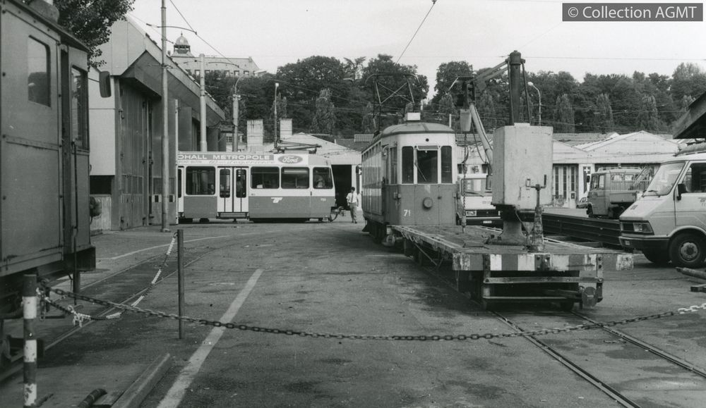 3149(494.42)_TPG_1987-05.jpgImage JpegL'automotrice de service Xe 4/4 71 et le wagon grue X4 638 des TPG stationnent dans la zone Arve du dépôt de la Jonction / Jeremy Wiseman
