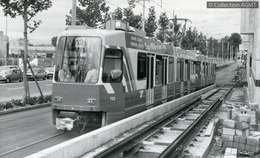 3144(494.42)_TPG_1987-05.jpgImage JpegLes automotrices 752 et 753, circulant exceptionnellement en double traction à l'occasion de l'inauguration du prolongement de la ligne 12 de Carouge au Bachet passent à la hauteur du nouveau dépôt du Bachet / Jeremy Wiseman