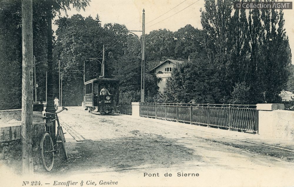 [Compagnie] GV (Genève-Veyrier)Index. décimale : 4141 Tramway et métro léger interurbain et vicinal - véhicule - service régulier, transport de voyageur Paysages suisses : pont de Sierne près Genève et le Salève [document graphique à deux dimensions] . - Genève : Maison Paisant-L'Huillier, [ca 1898] . - 1 photo : noir et blanc ; 13 x 18 cm.