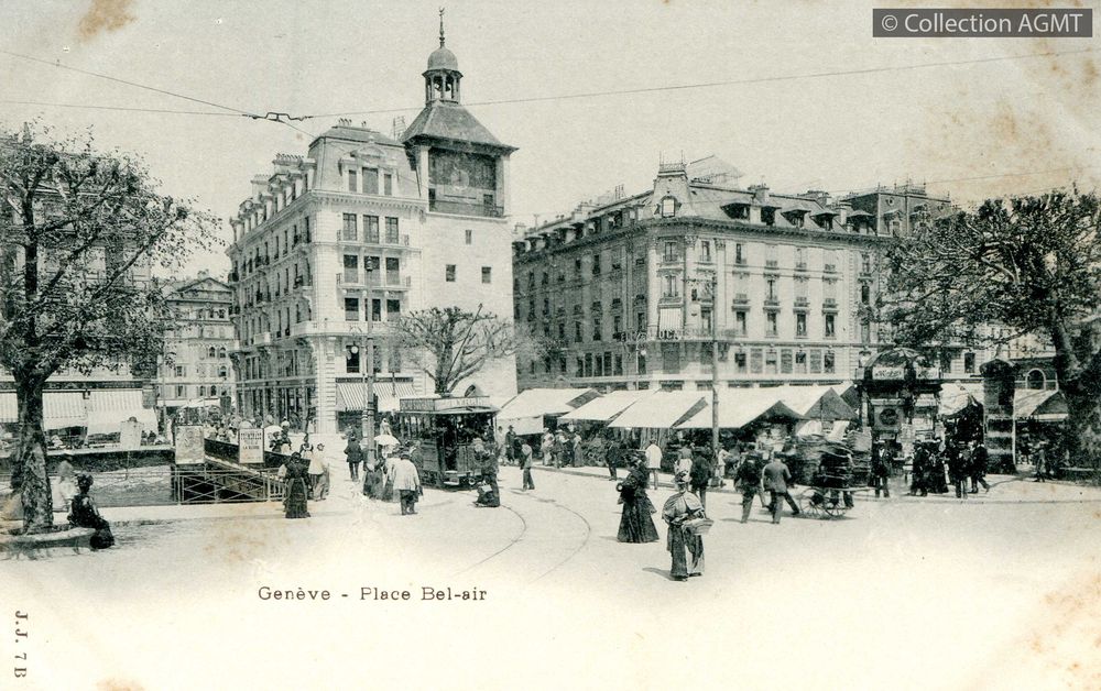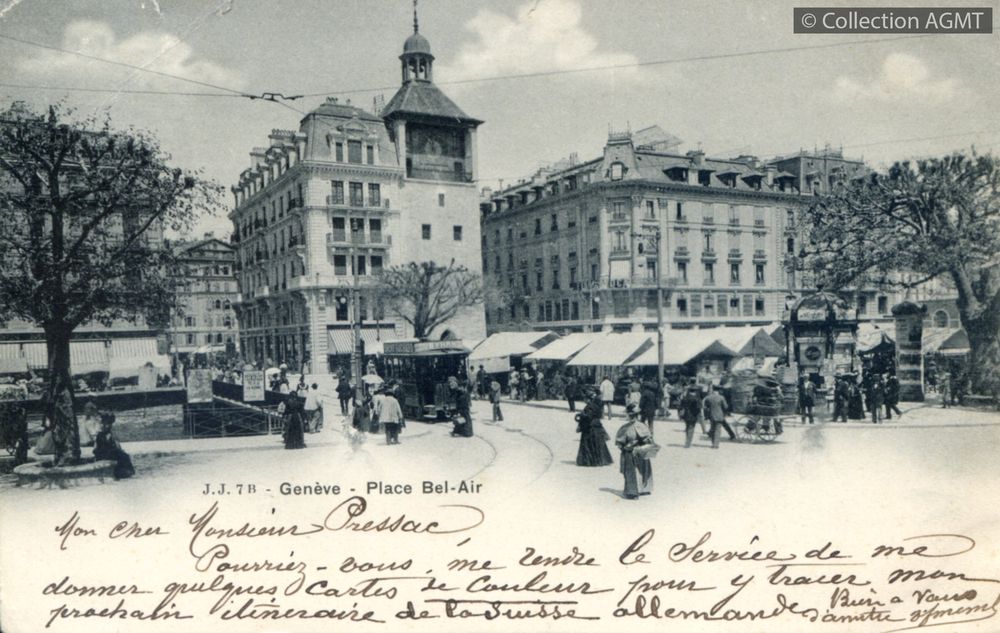 Genève : place Bel-Air [document graphique à deux dimensions] . - [S.l.] : JJ, [ca 1899] . - 1 carte postale : noir et blanc ; 9 x 14 cm. Langues : Français (fre)