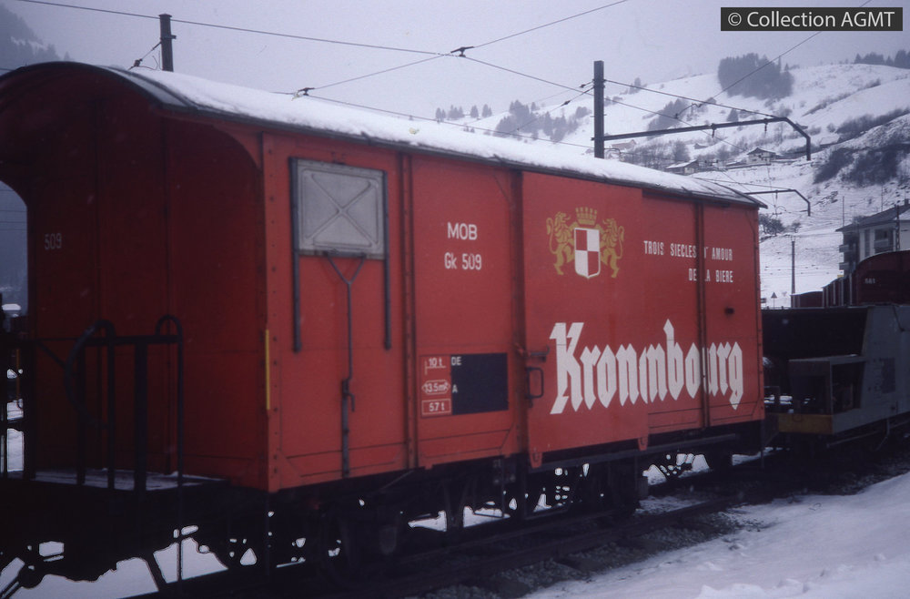 Affiner la recherche Interroger des sources externesWagon couvert Gk 509 du MOB en livrée publicitaire "Kronenbourg" au dépôt de Montbovon / François Chapuis