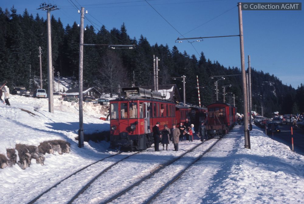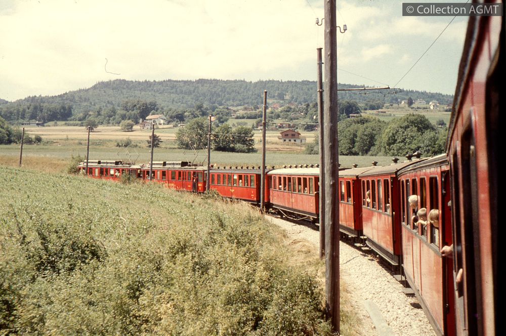 PermalinkUn convoi du NStCM, mené par l'automotrice ABDe 4/4 1, stationne à l'extrémité de la gare de La Cure, côté France / Gaston Guignard