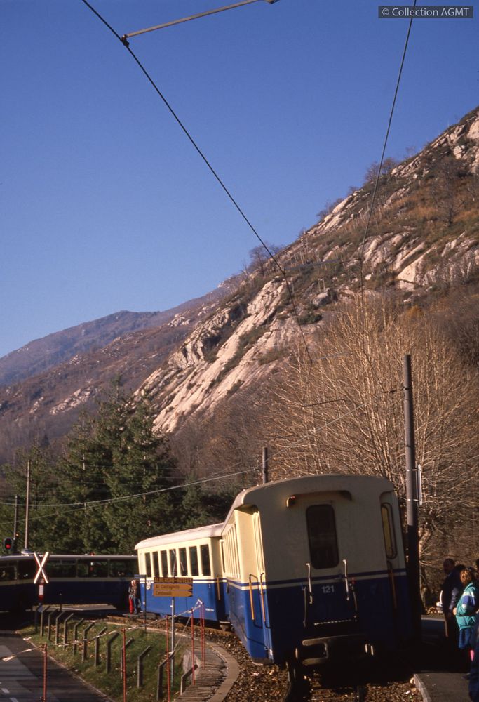 PermalinkUn convoi FART formé de l'automotrice ABDe 4/4 1, reconstruite, et d'une voiture à bogies, marque l'arrêt en gare de Ponte Brolla / Jeremy Wiseman