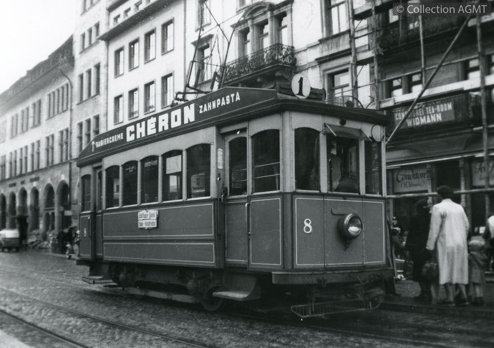 [Compagnie] SchStIndex. décimale : 3141 Tramway et métro léger urbain - véhicule - service régulier, transport de voyageur Automotrice 8 des SchSt en service sur la ligne 1 à destination d'Ebnat [document graphique à deux dimensions] / Jeremy Wiseman (1933-2022), Photographe . - [S.l.] : [s.n.], [ca 1980] . - 1 photographie : noir et blanc ; 11 x 15 cm.
