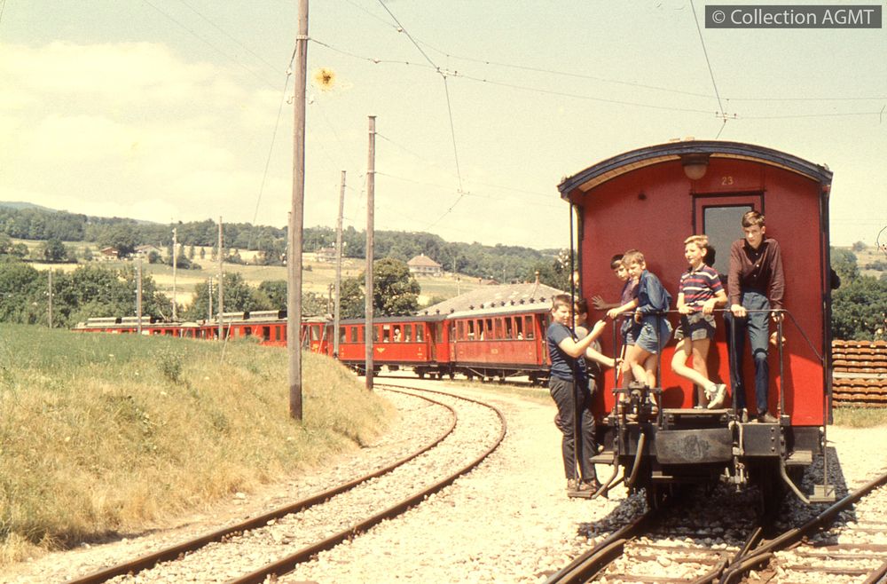 PermalinkVue depuis l'arrière d'un long convoi de skieurs du NStCM à destination de La Cure, qui marque l'arrêt en gare de Genolier / Gaston Guignard