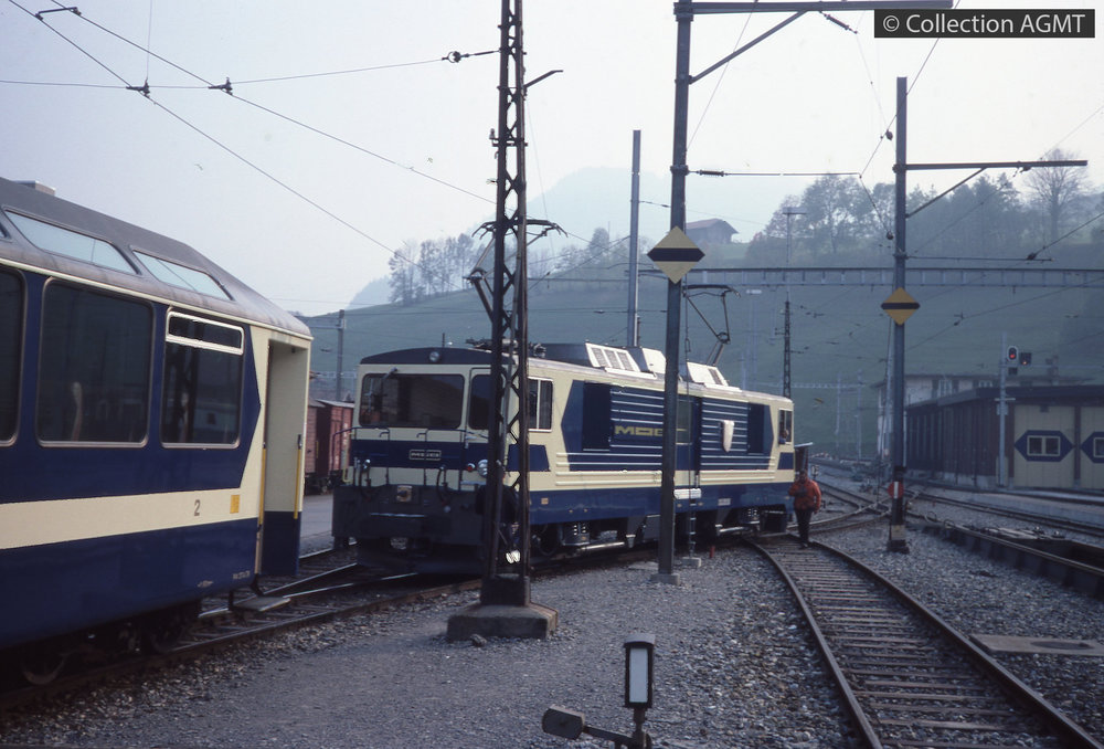 PermalinkPermalinkLa locomotive Gm 4/4 2004 du MOB stationne sur une voie de garage de Zweisimmen en tête d'une rame de voitures panoramiques / Jeremy Wiseman