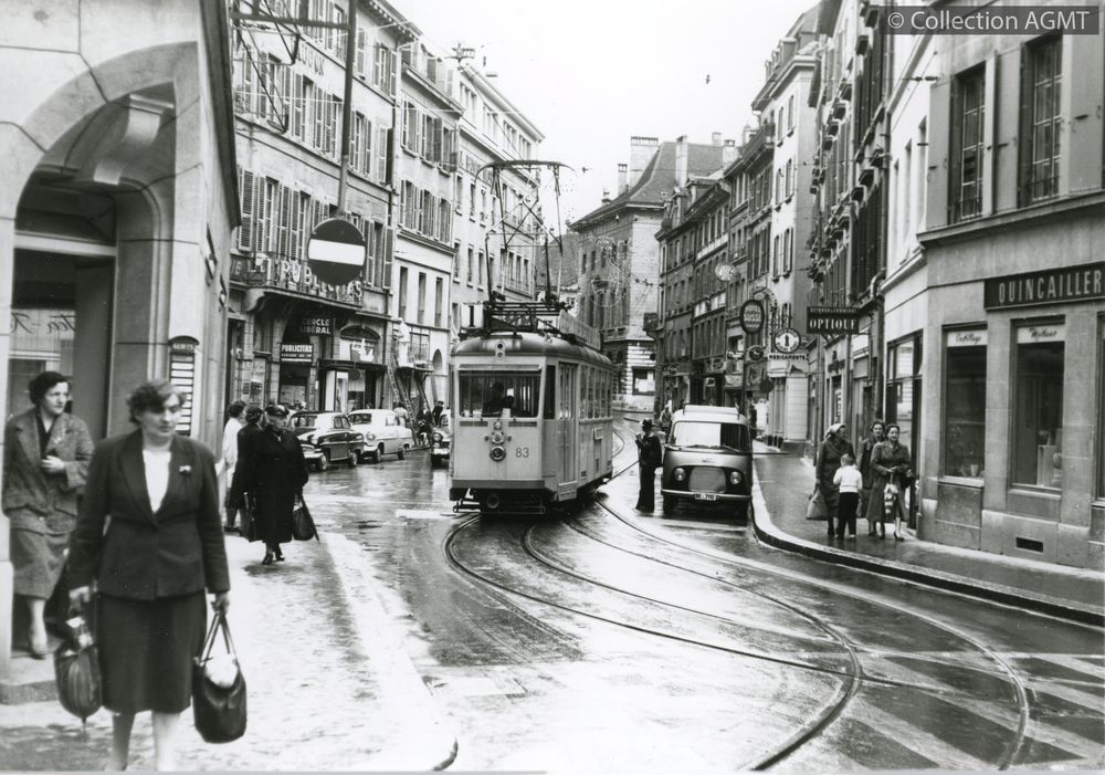 [Compagnie] TN (Neuchâtel)Index. décimale : 3141 Tramway et métro léger urbain - véhicule - service régulier, transport de voyageur Neuchâtel : devant un convoi de la ligne 3 mené par l'automotrice 71, l'automotrice 63 de la ligne 6 débouche de la rue de l'Hôpital dans la rue du Seyon [document graphique à deux dimensions] / Gaston Martin, Photographe . - Genève : Migros, 2008 . - 1 photo : noir et blanc ; 11 x 16 cm.
