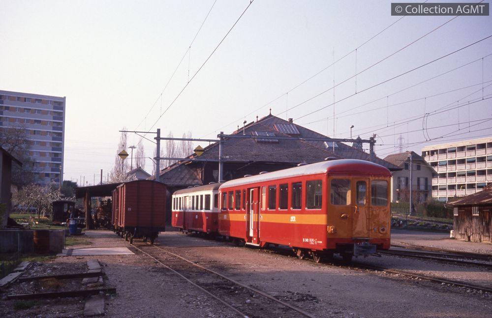 Affiner la recherche Interroger des sources externesL'automotrice ABDe 4/4 2 du NStCM stationne devant les portes fermées du dépôt des Plantaz à Nyon / Gaston Guignard