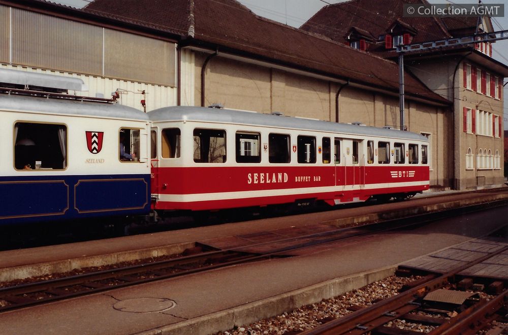 PermalinkAttelée à l'automotrice restaurant "Ankerstube", la voiture buffet bar "Seeland" du BTI attend ses voyageurs en gare de Taeuffelen / Gaston Guignard