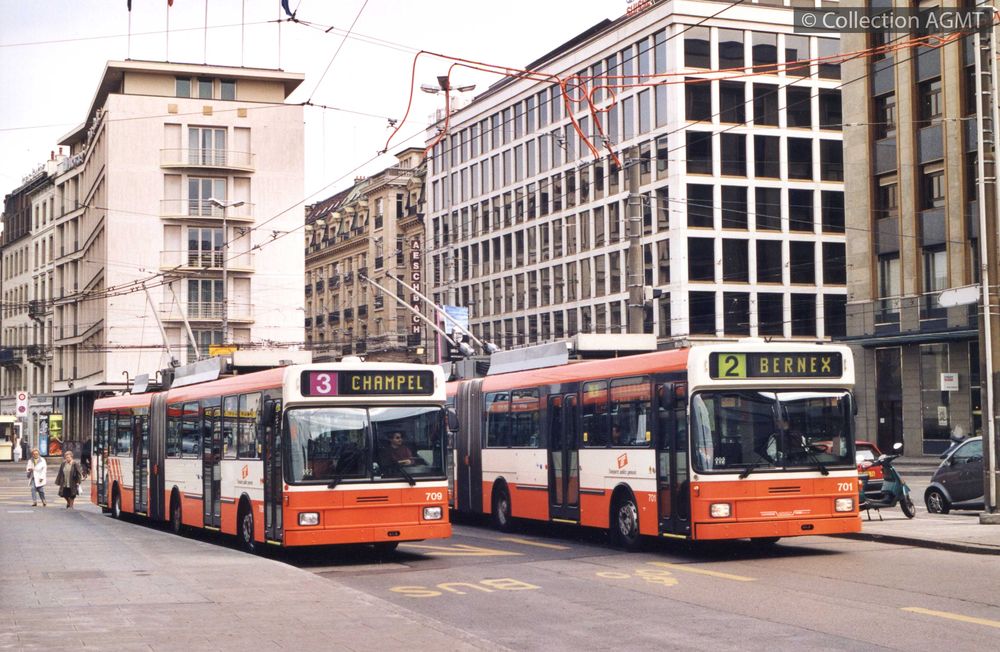 Genève, place de Bel-Air : en service sur la ligne 2 à destination de Bernex, le trolleybus 701 des TPG dépasse le trolleybus 709 de la ligne 3 qui marque l'arrêt |