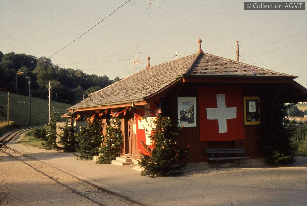 PermalinkVue plongeante sur un convoi du NStCM à destination de Nyon qui arrive en gare du Muids dont le bâtiment a été récemment victime d'un pyromane / Gaston Guignard