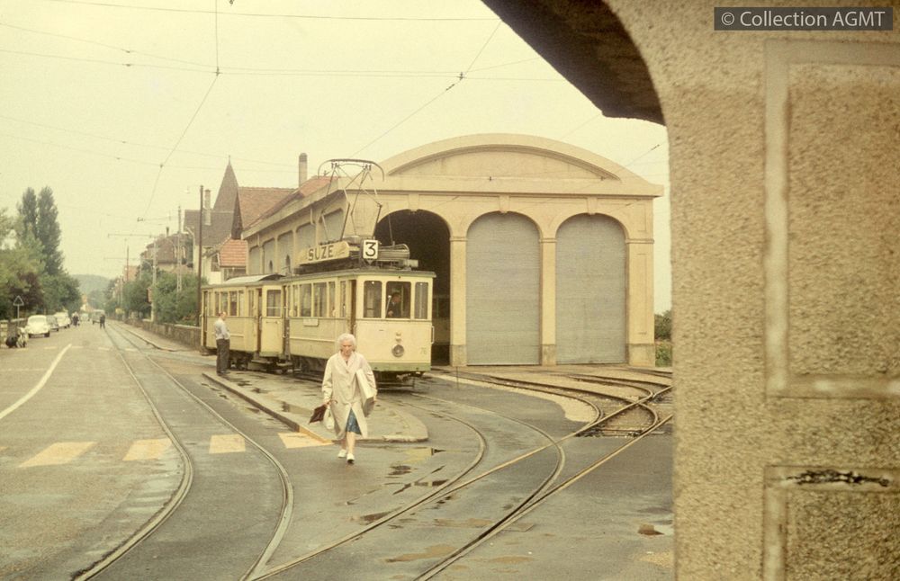 3141(494.43)_Tn_1964-03_d.jpgImage JpegUn convoi TN de la ligne 3, formé de l'automotrice 76 et d'une remorque, stationne au terminus de la ligne à côté du dépôt de Corcelles / Richard J.S. Wiseman