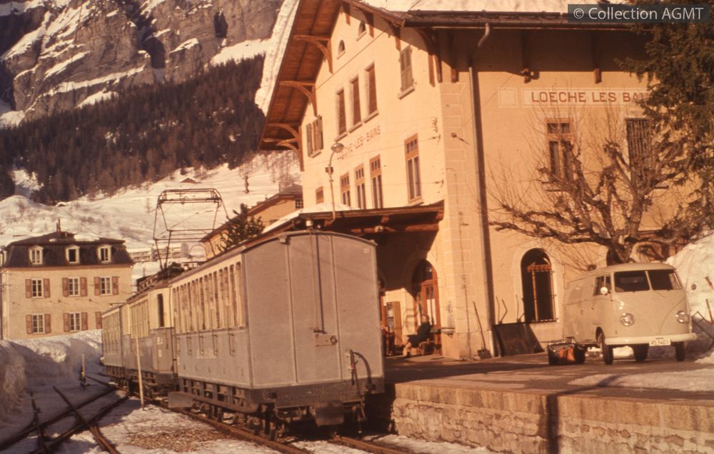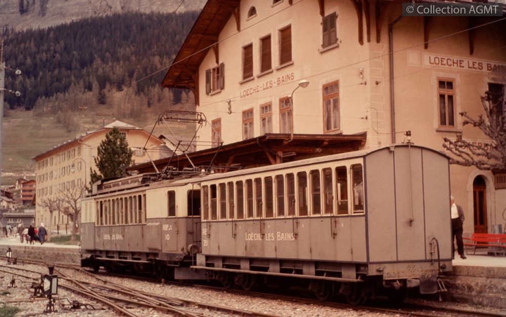 PermalinkLa gare terminus de Loèche-les-Bains avec l'automotrice ABFeh 4/4 no 11 qui va venir se placer devant les deux voitures AB4 nos 20 et 22 / Jean-Louis Rochaix