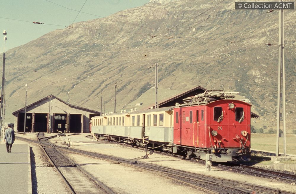 Code-barres Cote Support Localisation Section Disponibilité 6700014072 4341(494.13) FO 1965/01 Photographie Bachet Photographies Disponible Un convoi de voitures en livrée SchB, mené par la locomotive HGe 2/2 24 du FO, stationne sur une voie du dépôt d'Andermatt / Jeremy Wiseman