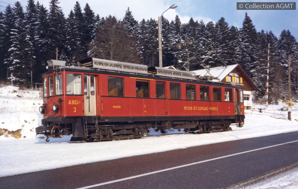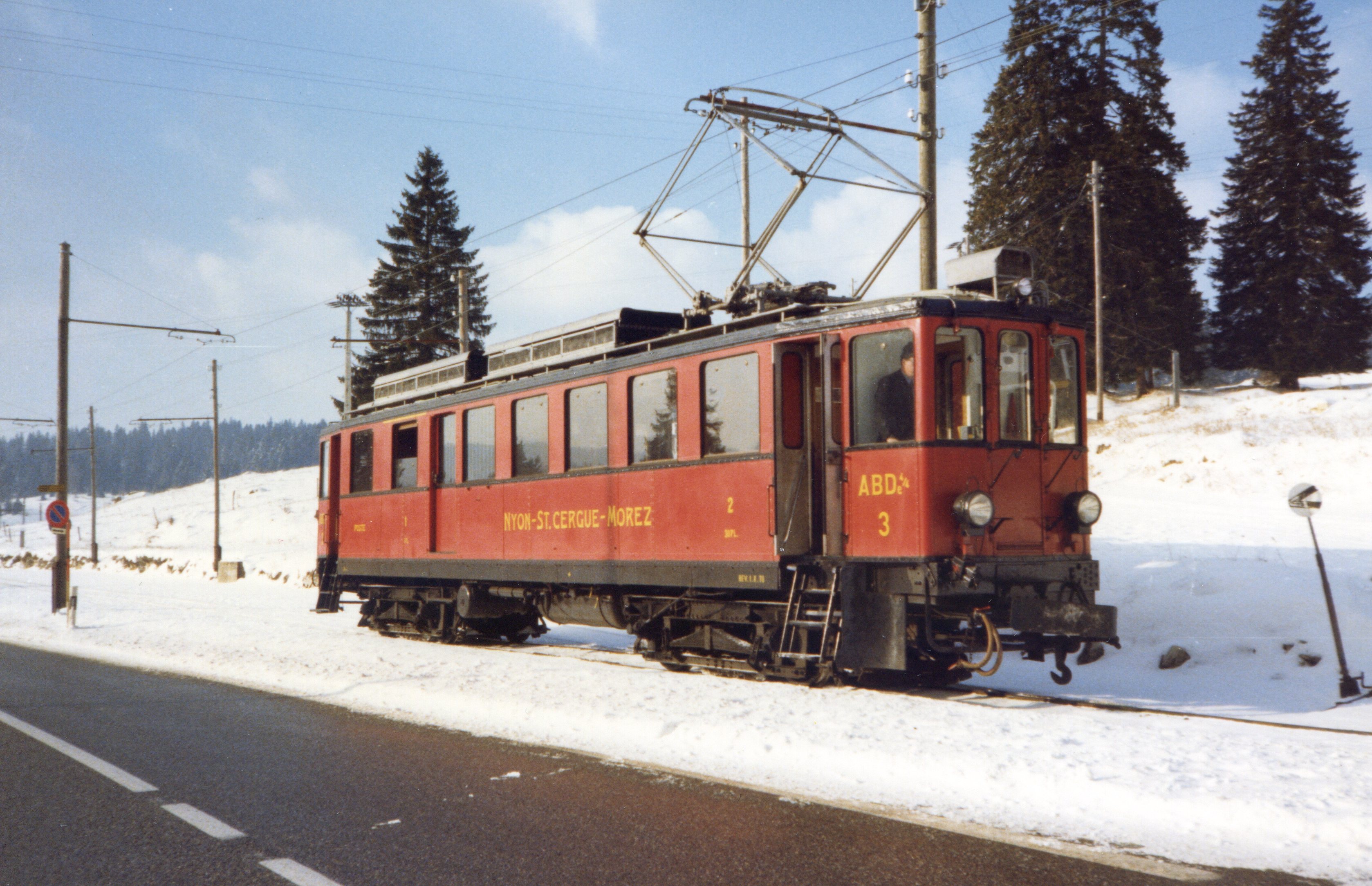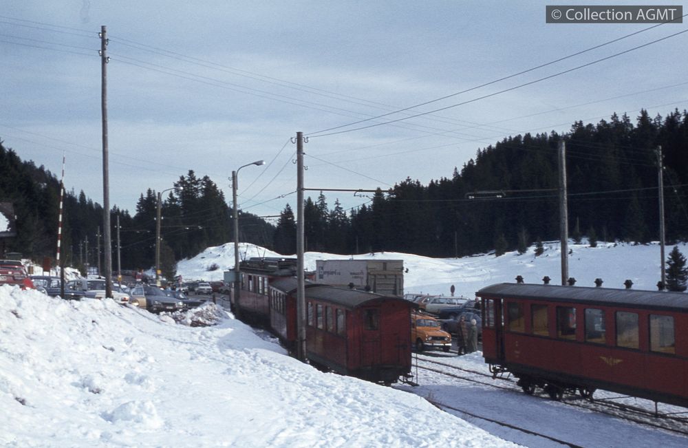 PermalinkUn convoi du NStCM formé d'une automotrice Be 4/4, d'une voiture B4 et d'une voiture-pilote Bt4, stationne dans la neige à la halte de La Givrine / Gaston Guignard