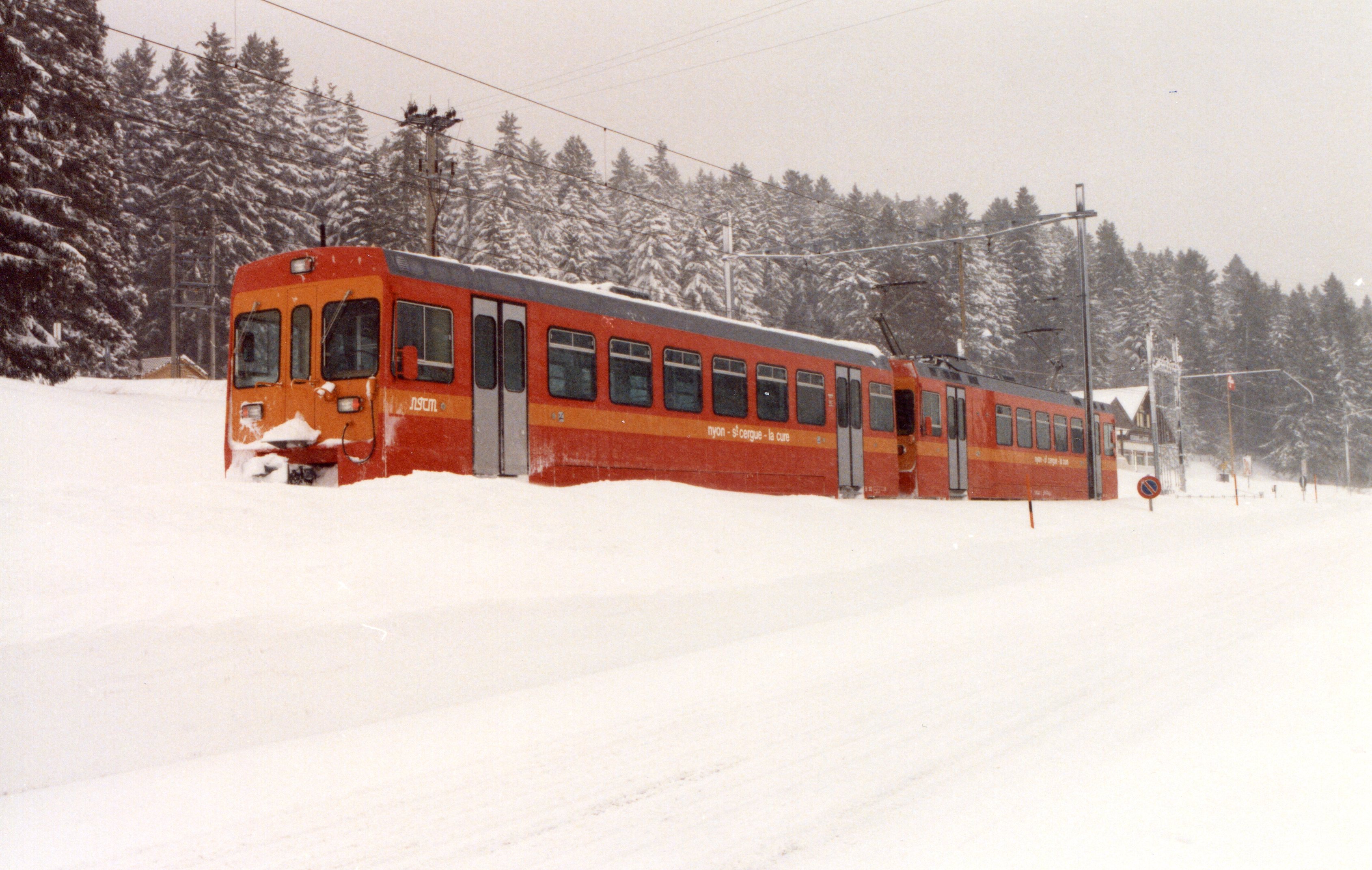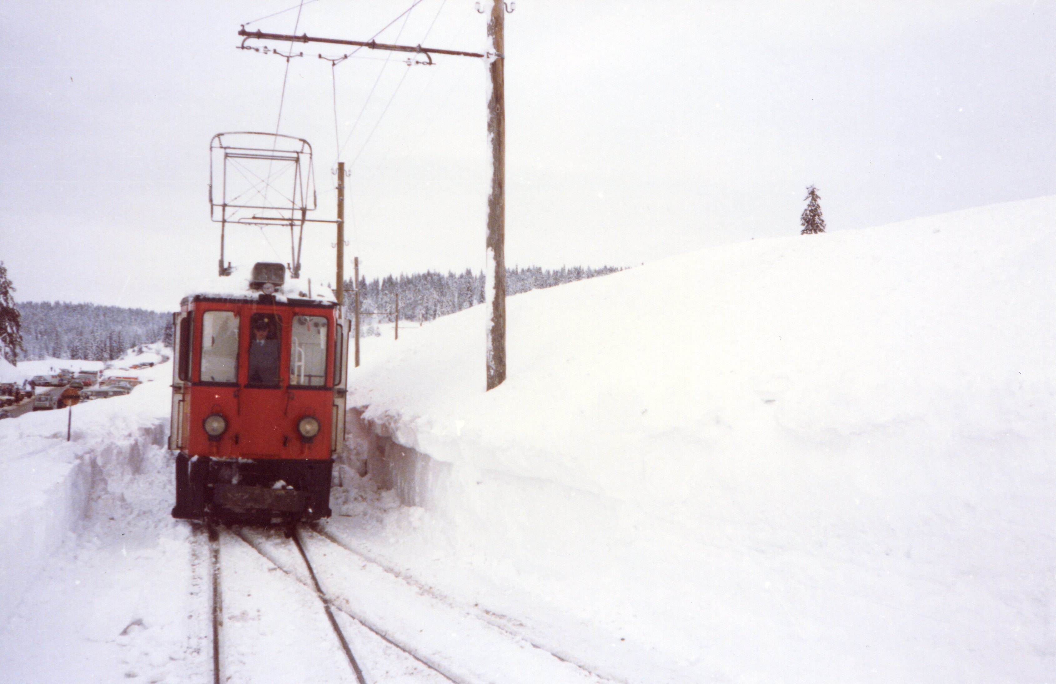 PermalinkPermalinkPermalinkDans la neige, un convoi du NStCM formé d'une automotrice Be 4/4 et d'une voiture-pilote Bt4 marque l'arrêt à La Givrine / Gaston Guignard