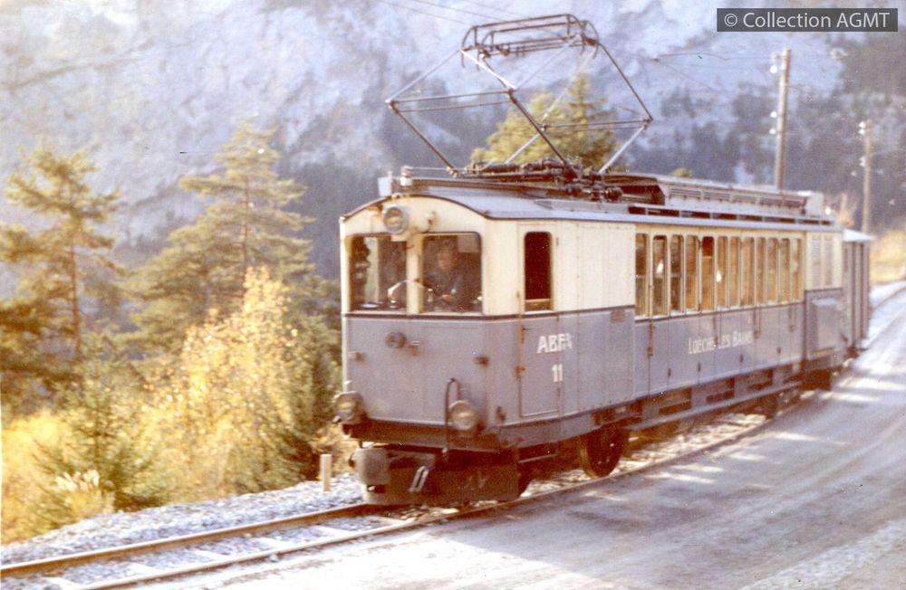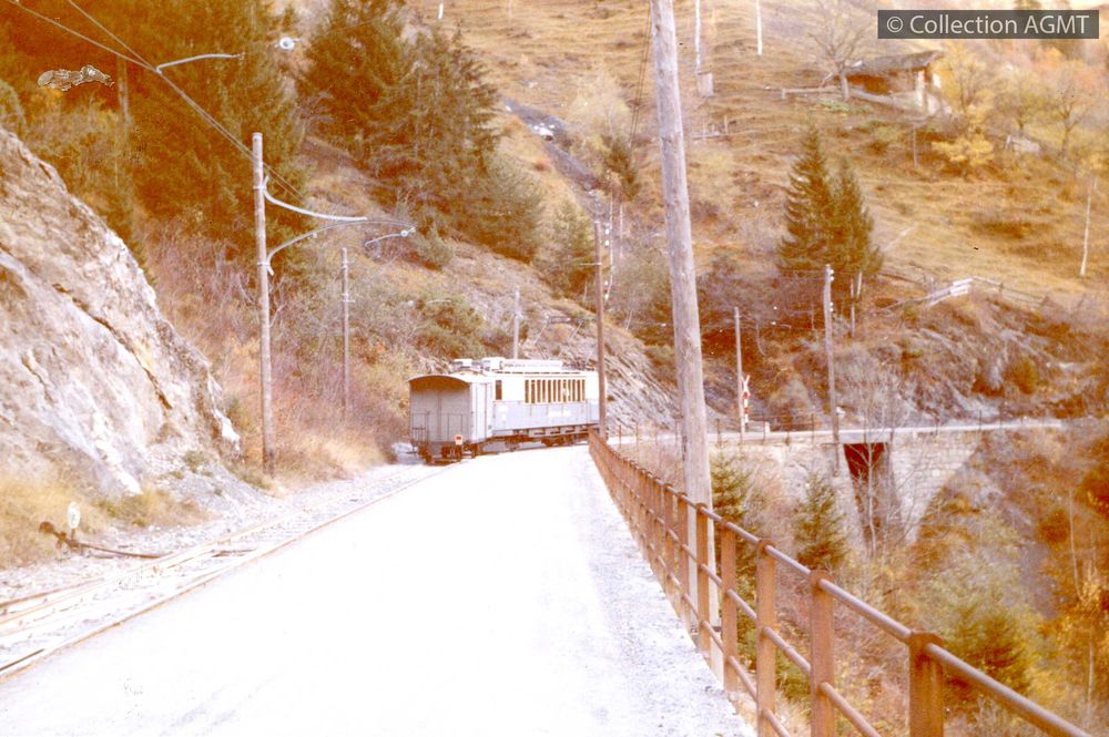 PermalinkPermalinkUn convoi du LLB formé de l'automotrice 11 et d'un wagon couvert circule sur un tronçon de voie en accotement routier en-dessous d'Albinen / Gaston Martin