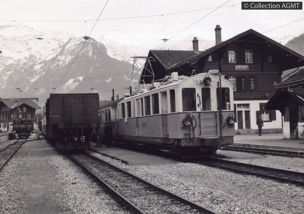 PermalinkPermalinkEn tête de son convoi pour Zweisimmen, une automotrice ABFe 4/4 du MOB stationne en gare de La Lenk à côté d'un wagon CFF chargé sur un cadre porteur / Jacques Bazin
