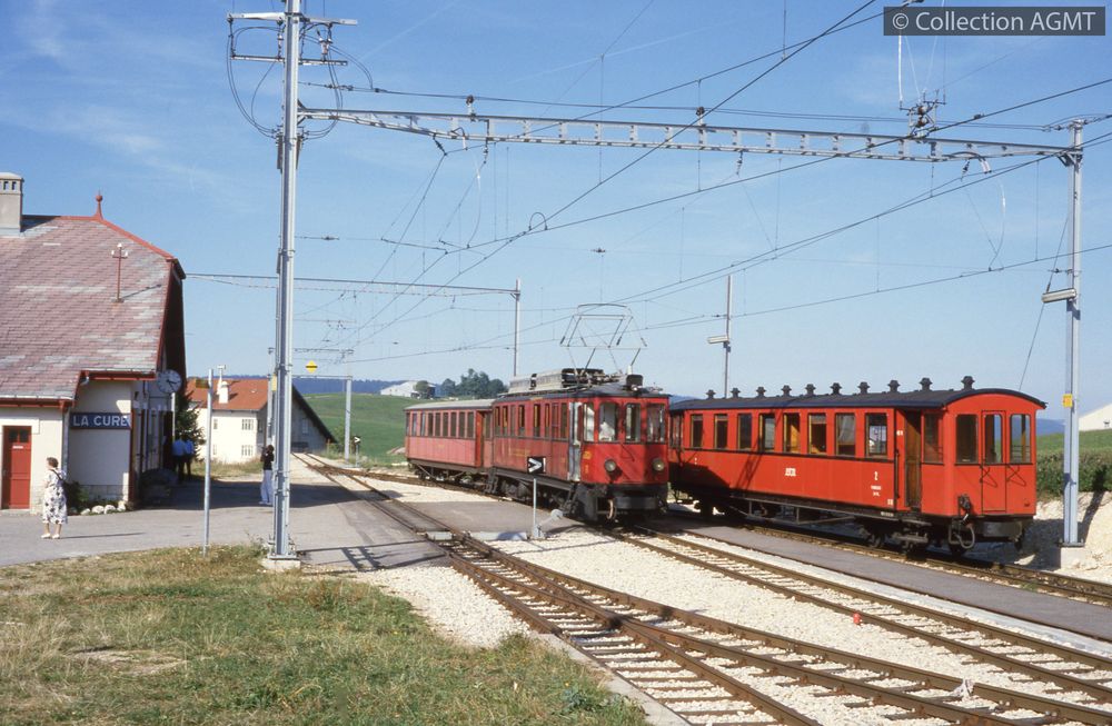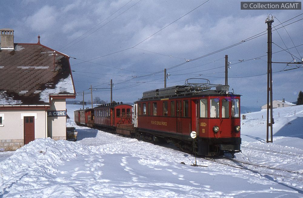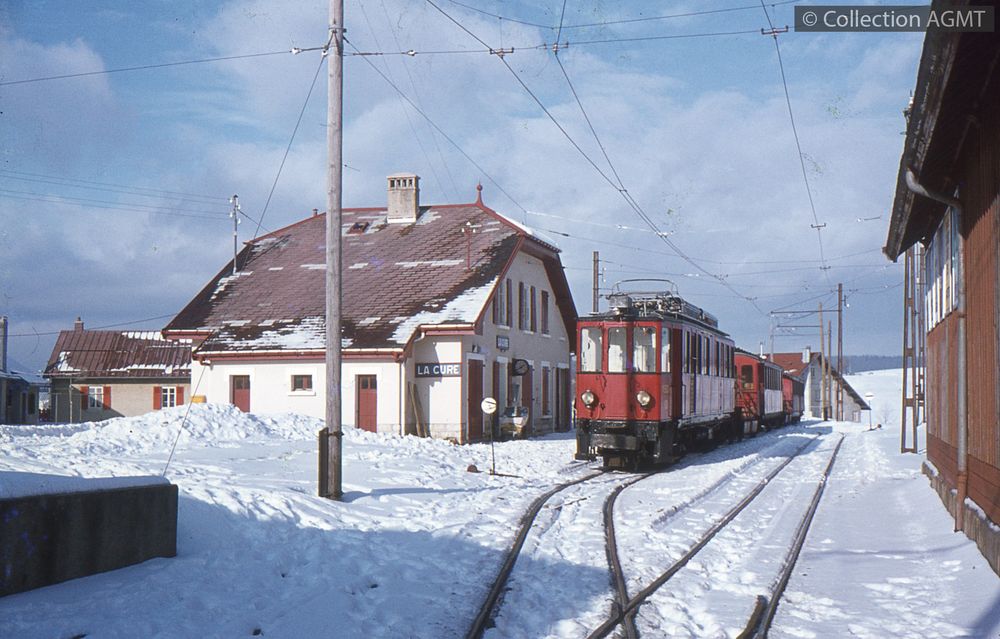 PermalinkUn convoi du NStCM, mené par l'automotrice ABDe 4/4 1, stationne à l'extrémité de la gare de La Cure, côté France / Gaston Guignard