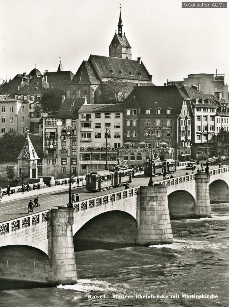 [Année] 1930Index. décimale : 3141 Tramway et métro léger urbain - véhicule - service régulier, transport de voyageur Basel : Mittlere Rheinbruecke mit Martinskirche = [Bâle : pont du Milieu et l'Eglise St. Martin] [document graphique à deux dimensions] . - Zuerich : Photoglob-Wehrli, [ca 1930] . - 1 carte postale : noir et blanc ; 15 x 11 cm. - (Photoglob-Wehrli; w 5184) .