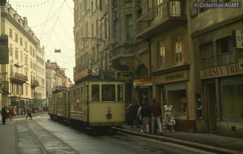Affiner la recherche Interroger des sources externesDeux automotrices de la ligne 3 des TN, dont la 74, entourent une remorque à la rue du Seyon / Richard J.S. Wiseman