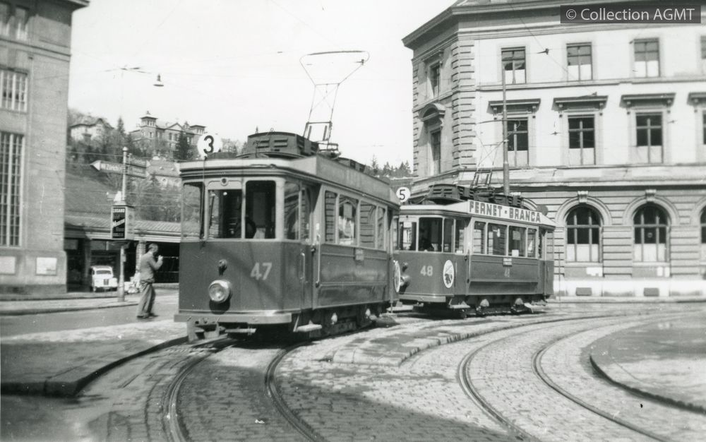 [Compagnie] TStG (St-Gall)Index. décimale : 3141 Tramway et métro léger urbain - véhicule - service régulier, transport de voyageur En service sur les lignes 3 et 5, les automotrices 47 et 48 des TStG circulent à proximité de la gare CFF de St-Gall [document graphique à deux dimensions] / Jeremy Wiseman (1933-2022), Photographe . - [S.l.] : [s.n.], [ca 1980] . - 1 photographie : noir et blanc ; 9 x 15 cm.