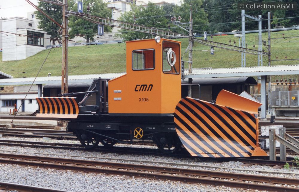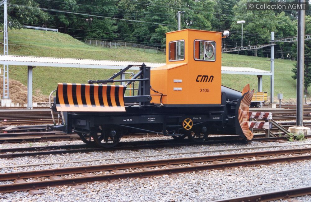 PermalinkVue de 3/4 du chasse-neige X 105 des CMN stationné sur une voie de garage de la gare de la Chaux-de-Fonds / Gaston Guignard