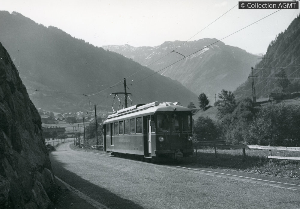 [Ligne] SchwandenIndex. décimale : 4141 Tramway et métro léger interurbain et vicinal - véhicule - service régulier, transport de voyageur L'automotrice BFe 4/4 5 du SeTB circule en accotement de la chaussée à proximité d'Engi-Vorderdorf [document graphique à deux dimensions] / Jeremy Wiseman (1933-2022), Photographe . - [S.l.] : [s.n.], [ca 1980] . - 1 photographie : noir et blanc ; 10 x 14 cm.