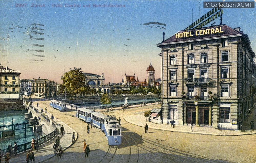 [Année] 1920Index. décimale : 3141 Tramway et métro léger urbain - véhicule - service régulier, transport de voyageur Zuerich : Hotel Central und Bahnhofbruecke [document graphique à deux dimensions] . - Zuerich : Photoglob, [ca 1920] . - 1 carte postale : colorisée ; 9 x 14 cm. - (Photoglob; v 2997) .