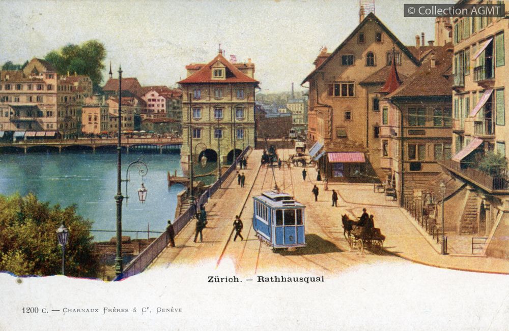 [Année] 1900Index. décimale : 3141 Tramway et métro léger urbain - véhicule - service régulier, transport de voyageur Zuerich : Rathhausquai [i.e. Rathausquai] [document graphique à deux dimensions] / Charnaux Frères, Photographe . - Genève : Charnaux frères & cie, [ca 1900] . - 1 carte postale : colorisée ; 10 x 14 cm. - (Charnaux frères; 1200 c) .