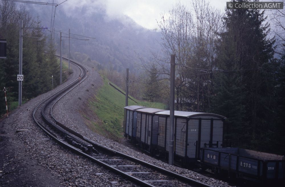 Code-barres Cote Support Localisation Section Disponibilité 6700010852 4144(494.45) BVB 1985/01 Photographie Bachet Photographies Disponible PermalinkPermalinkTrois wagons couverts et un wagon à bords bas du BVB stationnent sur la voie de garage de Fontannaz-Seulaz / Jeremy Wiseman