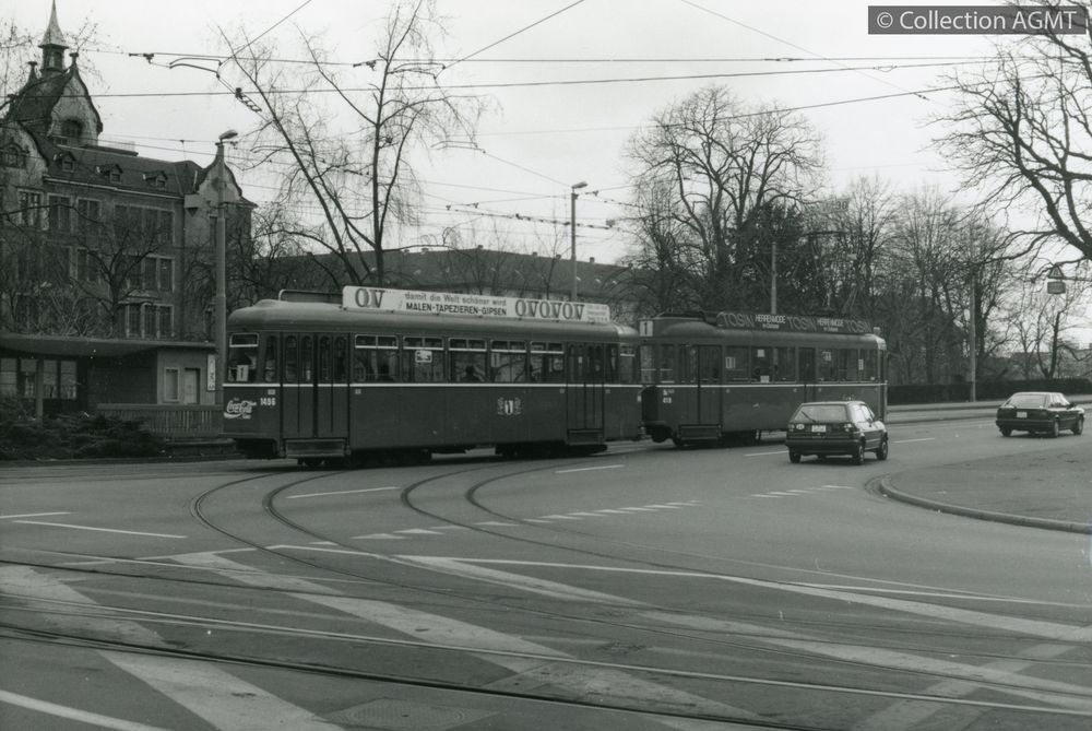 3141(494.231)_BVB_1988-02.jpgImage JpegUn convoi BVB de la ligne 1, formé de l'automotrice 419 et de la remorque 1496, circule au Riehenring / Jeremy Wiseman