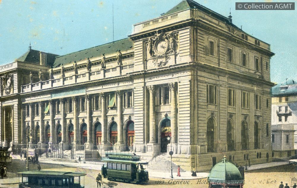 [Année] 1908Index. décimale : 3141 Tramway et métro léger urbain - véhicule - service régulier, transport de voyageur Genève : Hôtel des Postes [document graphique à deux dimensions] . - [S.l.] : LV, [ca 1908] . - 1 carte postale : colorisée ; 9 x 14 cm.