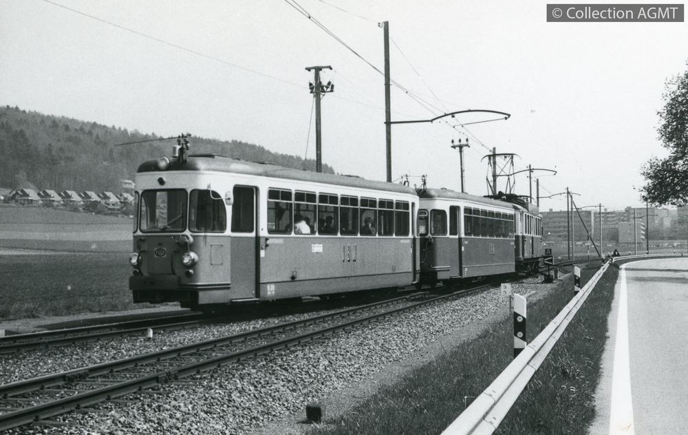 4341(494.24)_RBS_1985-07.jpgImage JpegTN-Dienstzuegli mit Be 2/2 64 (1912) und einem der fruehren NCB-Gueterwagen auf der Ueberlandlinie 5 / E. Christen