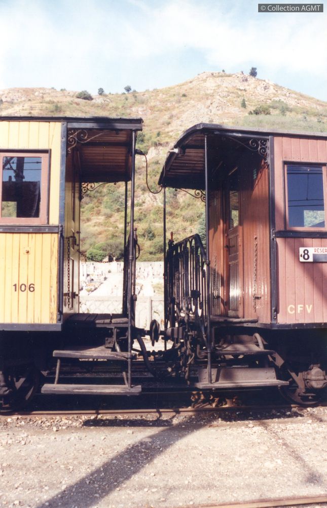 PermalinkGros plan sur l'attelage entre deux voitures ex-Réseau breton, exploitées par le CFV et stationnées en gare de Tournon / Gaston Guignard