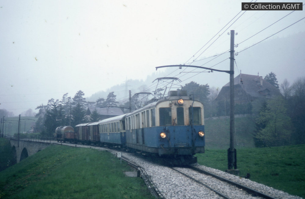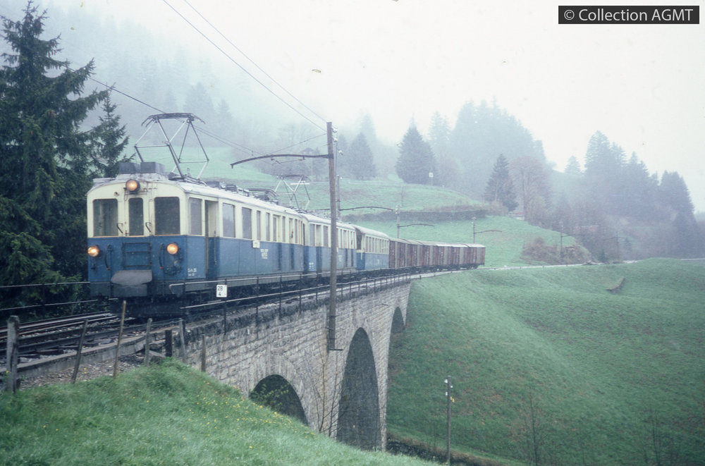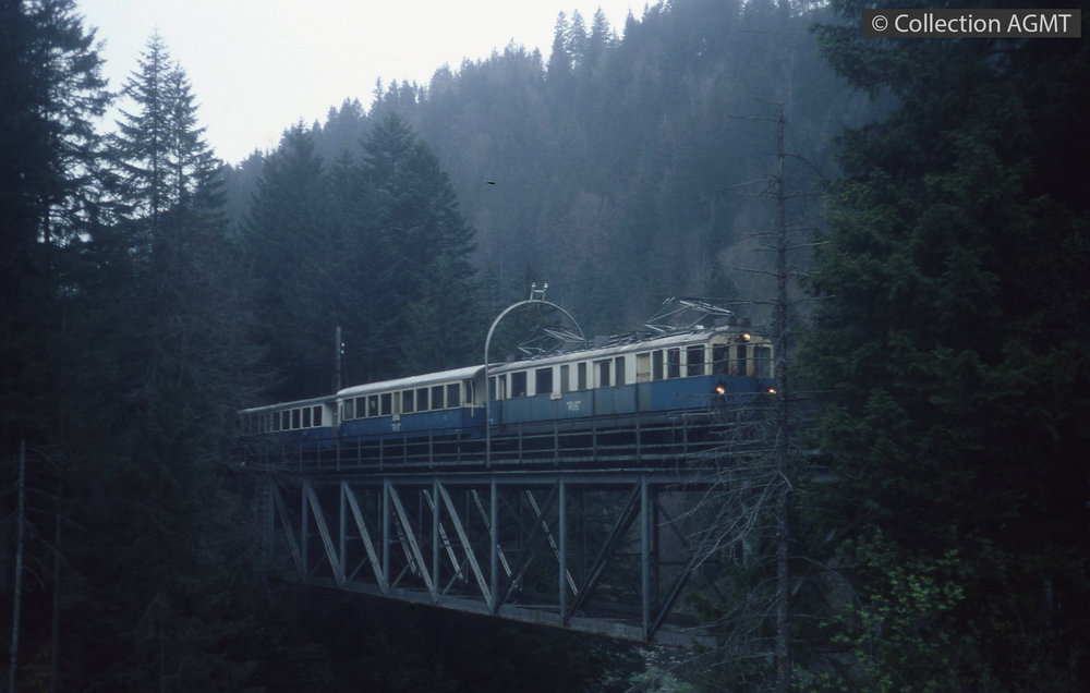 [Compagnie] MOBIndex. décimale : 4341 Chemin de fer interurbain et vicinal - véhicule - service régulier, transport de voyageur Sous la pluie qui tombe dru, un train mixte du MOB, mené par le fourgon automoteur De 4/4 25 et l'automotrice BDe 4/4 26 franchit un pont à proximité de Rossinière [document projeté ou vidéo] / François Chapuis, Photographe . - [S.l.] : Kodak, [ca 1981] . - 1 diapositive : couleur ; 5 x 5 cm.